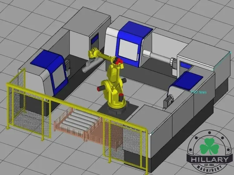 Exactly how we describe it......3 new or pre-existing CNC machines being tended to by 1 robot; with up to a 595 lb. max payload. For multi-op workpieces or 3 separate (or different) workpieces, this cell can be adapted with a 3D vision guidance system for loose and/or heavy workpieces. Eliminate your gib crane and the time it takes your operator to load a part using a jib crane. Add an optional flipping station for OP20, or secondary operations like a deburring station.